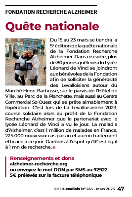 Les 15-16-22 et 23 mars, 86 jeunes bénévoles du lycée se sont engagés auprès de notre partenaire la fondation recherche Alzheimer, pour quêter à l’occasion de la collecte nationale organisée par la fondation, sur le territoire de Levallois-Perret