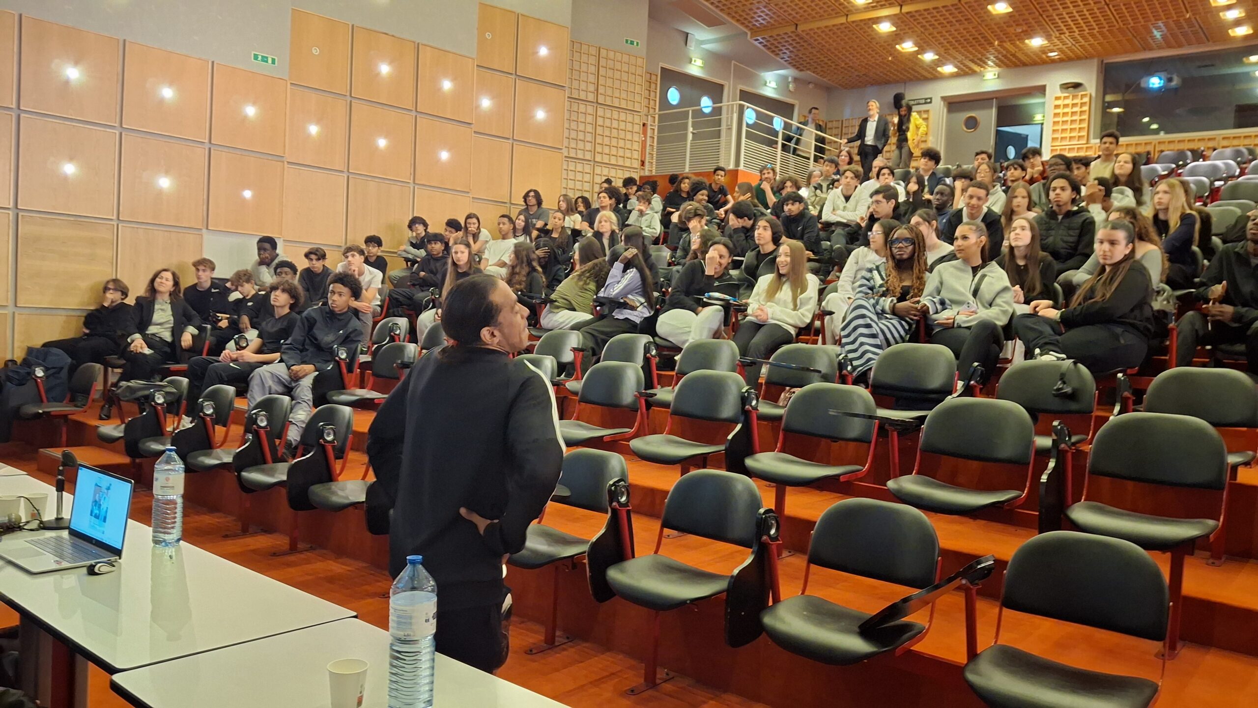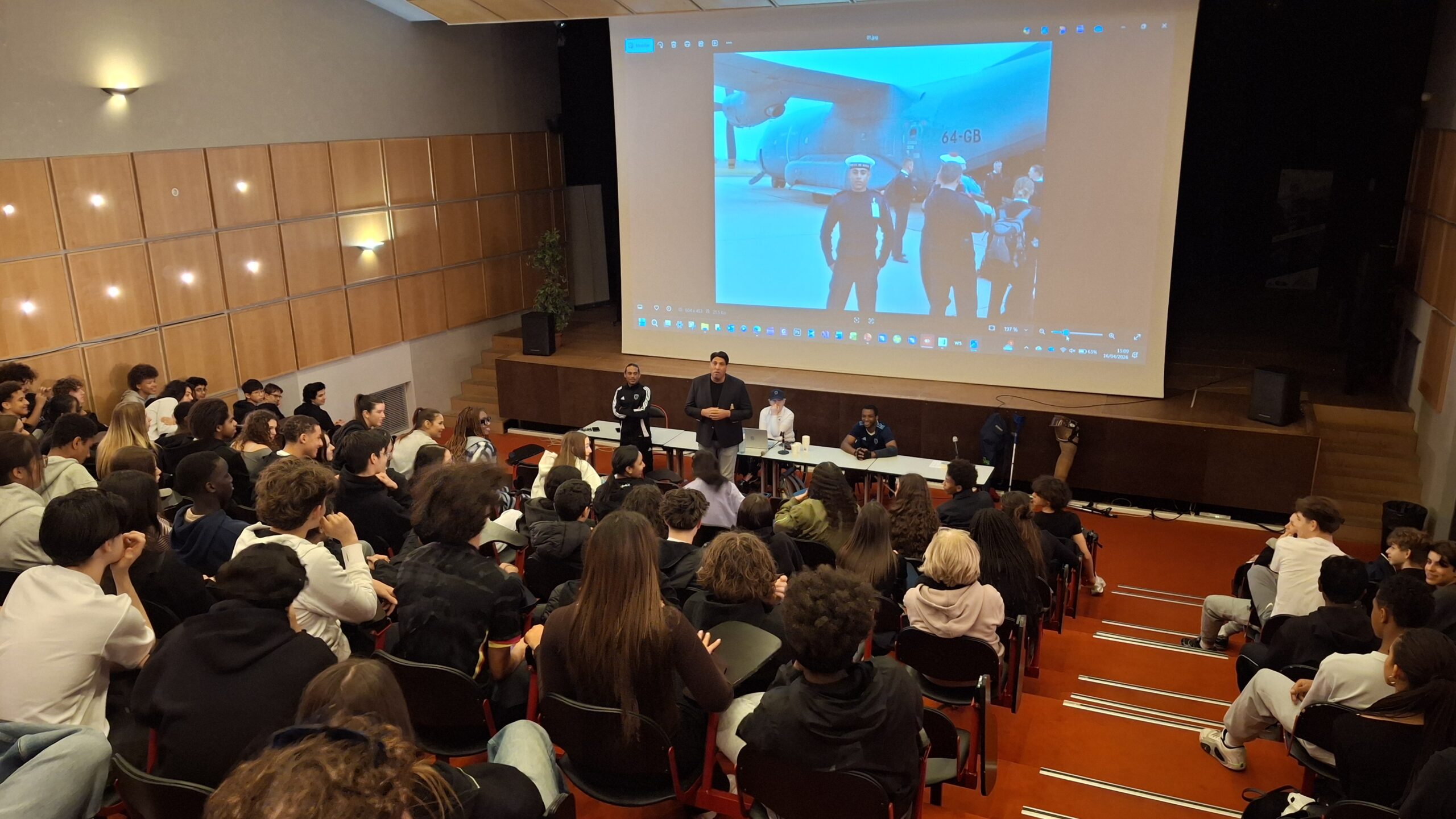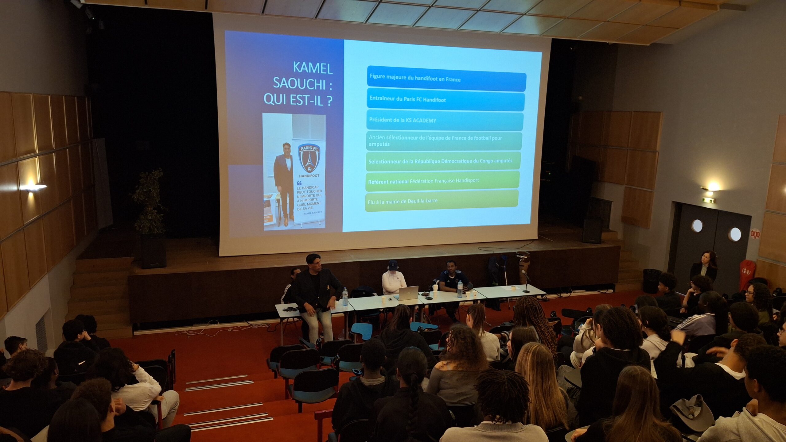 Incroyable rencontre cet après-midi au lycée pour les élèves de 2nde avec Kamel Saouchi, entraîneur du Paris FC Handifoot et président de la KS Academy, accompagné de trois para athlètes : Guy et Michaël, joueurs au Paris FC, ainsi que Laurence, championne d’Europe de parachutisme.