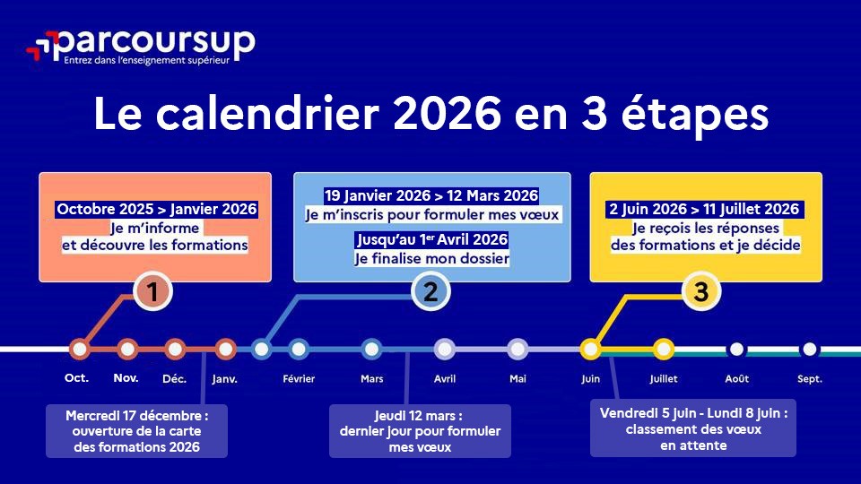 Retrouvez les dates importantes de Parcoursup dans l’agenda du lycée ou dans le calendrier officiel Parcoursup.